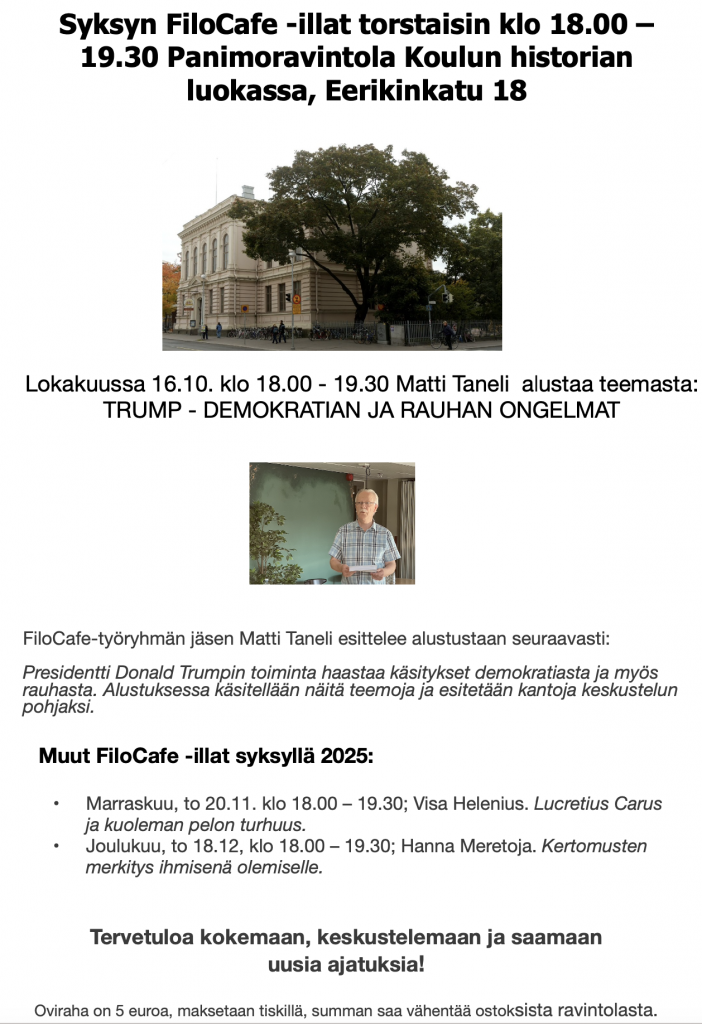 - KT Matti Taneli ja FM Veli-Matti Rissanen: Mitä Cicero ja Kant ajattelivat oikeudemukaisesta sodasta ja rauhasta? 24.9.2024 kello 18.00 – 19.30