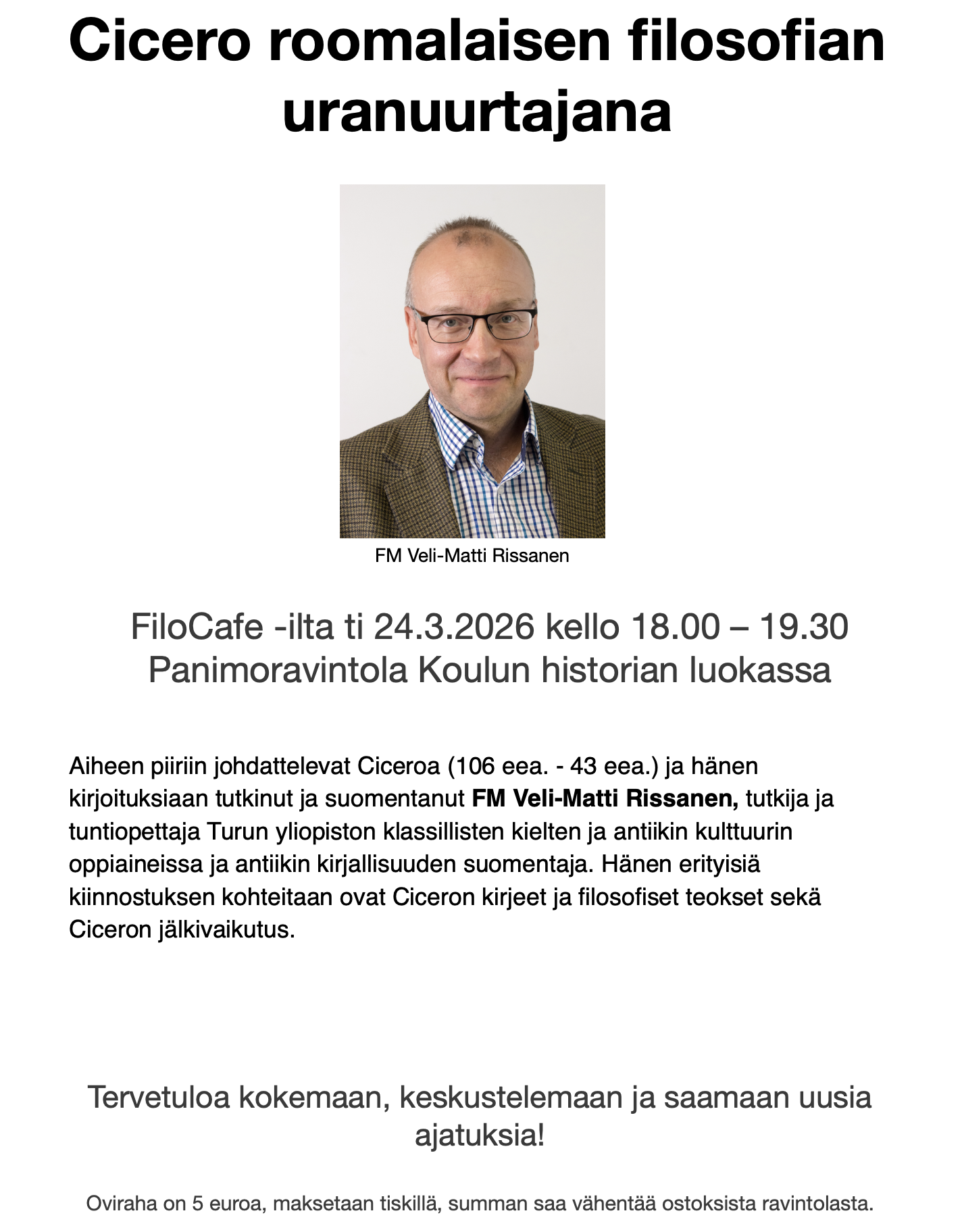 FiloCafe -ilta to 19.2.2026 kello 18.00 – 19.30 Panimoravintola Koulun historian luokassa, Eerikinkatu 18 Turussa, ks. tästä