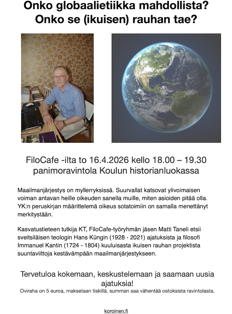 | Huhti | To 16.4. | Matti Taneli | Matti Taneli | ”Onko globaali- eli maailmanetiikka mahdollista?” |