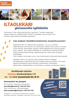 Halisten ILTAOLKKARI yksinäisille työikäisille 26.3.2026 kirjoittaja Leitim ILTAOLKKARIN esite löytyy myös tästä Jakotavat: Share on Facebook Share on X (Twitter) Share on WhatsApp Share on LinkedIn Share on Sähköposti