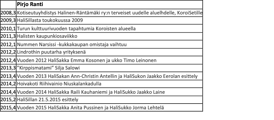 | Pirjo Ranti on vuonna 1997 perustetun Kotiseutuyhdistys Halinen-Räntämäki ry:n perustajajäsen. Hän on ollut mukana yhdistyksen toiminnassa hallituksen aktiivisena jäsenenä vuoteen 2023 saakka toimien sinä aikana niin yhdistyksen puheenjohtajana kuin hallituksen sihteerinä. Hänen merkityksensä yhdistyksen elinvoimaiselle toiminnalle on ollut tänä aikana ratkaisevaa. Rantien maatilasta Halistenkosken partaalla on muodostui tänä aikana yhdistykselle toiminnan keskipiste. Käytännössä tämä tarkoitti sitä, että yhdistyksen kokoukset pidettiin usein siellä, erilaiset yhdistyksen myyntiartikkelit ja muut tarvikkeet säilytettiin heillä. Rantien koko perhe avusti ja tuki yhdistyksen toimintaa esimerkiksi kuljetuspalveluilla. Rantien tila oli myös usein yhdistyksen järjestämien tapahtumien pitopaikkana. Pirjo Ranti huolehti myös siitä, että yhdistyksen varsinaiset toiminnat toteutettiin suunnitellulla tavalla. Näitä olivat esimerkiksi kaupunginosaviikkojen järjestäminen HaliSiltoineen ja kylvön siunauksineen, kahvi- ja virvoketarjoilut erityisesti Maarian seurakunnan järjestämissä tilaisuuksissa Koroisilla ja Halisten Virnamäellä. Hänen panoksensa vuosina 2008 – 2017 ilmestyneen KoroiSet-kaupunkiosalehden kotiseutuartikkelien toimittajana oli tärkeä. Lehden lopetettua julkaisunsa hän jatkoi kotiseutuartikkelien kirjoittamista verkkojulkaisussa Koroinen.fi. Siitä löytyy esimerkiksi hänen kirjoittamana historiikki kaupunkiosaviikosta Halisten alueella (ks. tästä ) |